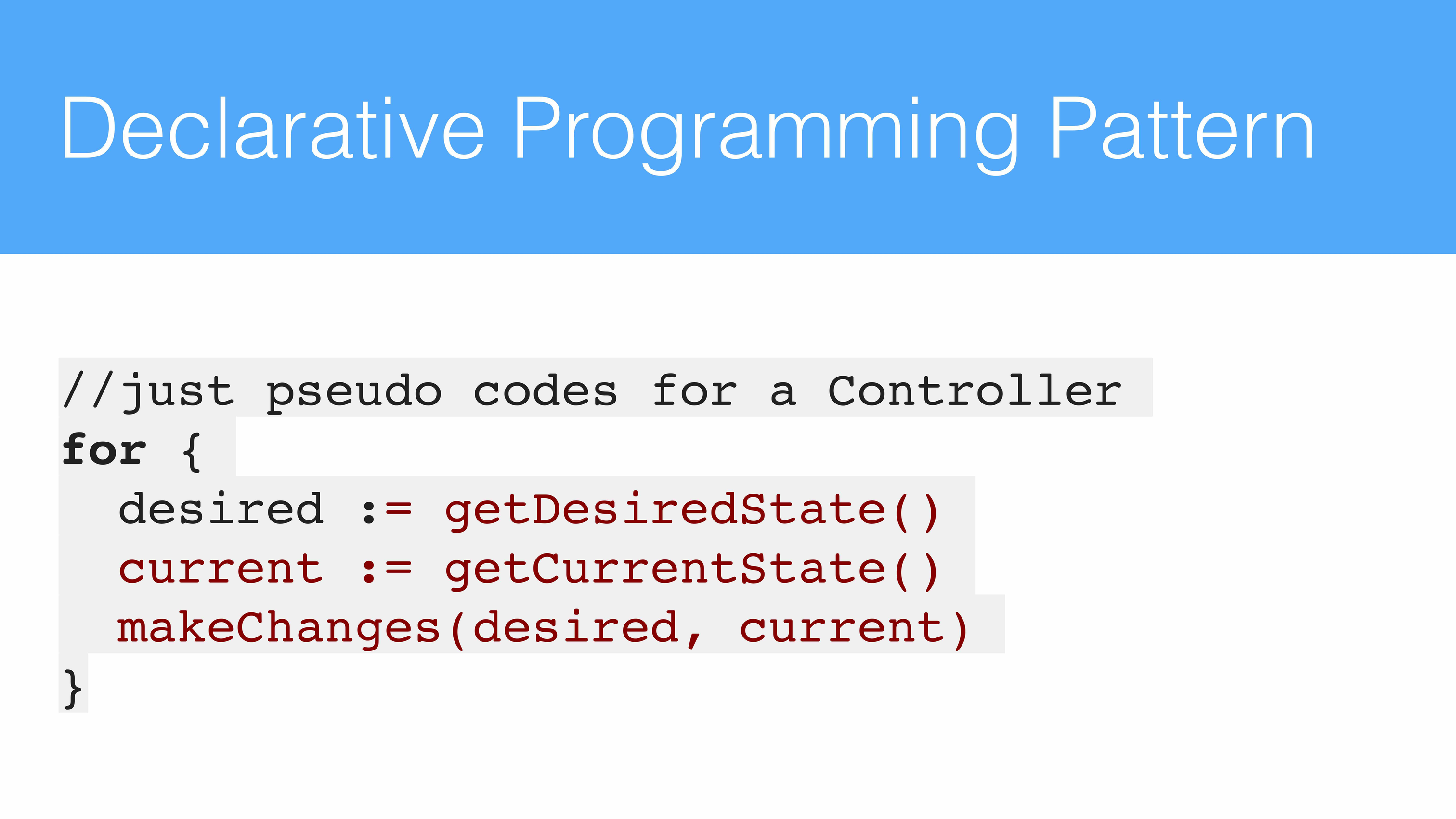 那么作为一个程序,Operator具体是如何设计和工作的呢? 这里简单介绍一下“申明式编程”的设计思想。“申明式编程”的设计思想是跟复杂的“命令式编程”的设计思想对应的。“申明式编程”的思路非常简单,可以用一段伪码表示。