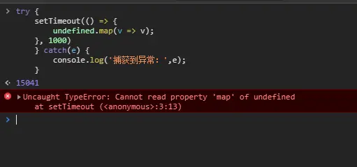 - 还有一个就是异步的以异常,上面我们说过他也是无法捕获的。下面例子我们采用sitTimeout的形式来模拟异步