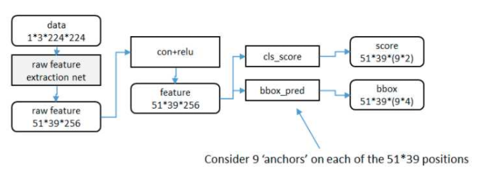 RPN网络的作用是输入一张图像,输出一批矩形候选区域,类似于以往目标检测中的Selective Search一步。网络结构是基于卷积神经网络,但输出包含二类softmax和bbox回归的多任务模型。网络结果如下(以ZF网络为参考模型):