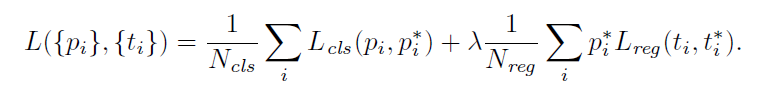 代价函数分为两部分,对应着RPN两条支路,即目标与否的分类误差和bbox的回归误差,其中Leg(ti,ti*) = R(ti-ti*)采用在Fast-RCNN中提出的平滑L1函数,作者认为其比L2形式的误差更容易调节学习率。注意到回归误差中Leg与pi相乘,因此bbox回归只对包含目标的anchor计算误差。也就是说,如果anchor不包含目标,box输出位置无所谓。所以对于bbox的groundtruth,只考虑判定为有目标的anchor,并将其标注的坐标作为ground truth。此外,计算bbox误差时,不是比较四个角的坐标,而是tx,ty,tw,th,具体计算如下: