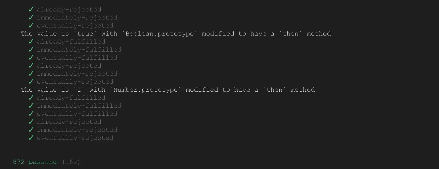 通过 promises-aplus-tests 可以测试我们实现的 Promise 类是否满足 Promise/A+ 规范。