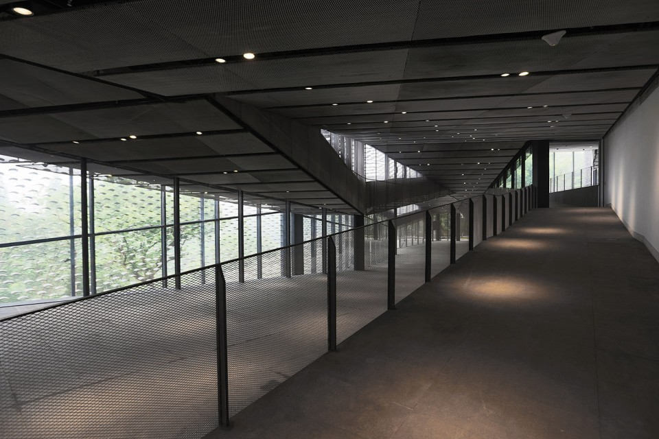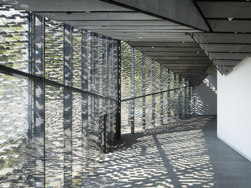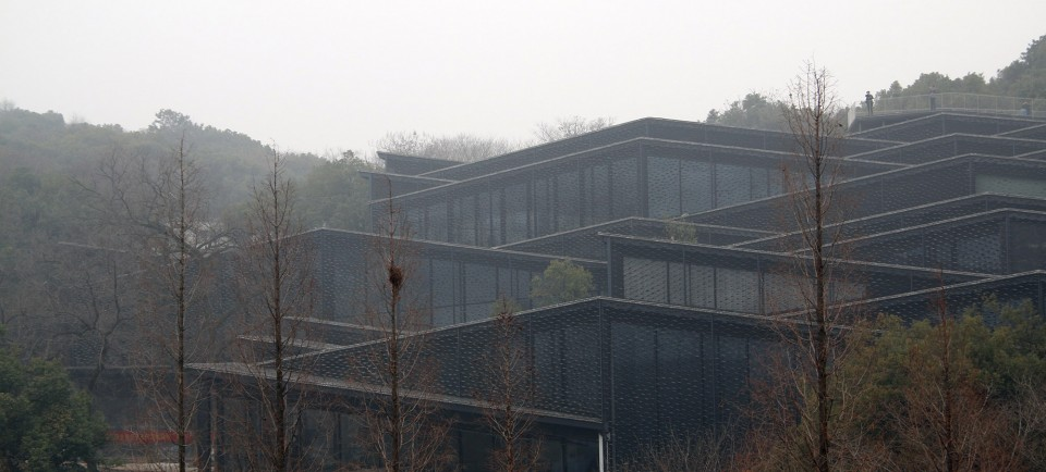 《中国美术学院民俗艺术博物馆》,2015年9月建成,坐落于中国美术学院校园内。原场地本是一座山坡上茶园。设计的初衷是要建造一座可以从地面上感知得到的博物馆,各楼层沿着坡地的起伏形成连续的空间。设计以平行四边形为基本单元,通过几何手法的分割和聚合,来处理错综错综复杂的地形。每个单元都有独立的屋顶,在外观上唤起人们记忆中鸟瞰村庄时青瓦连绵的景象。建筑屋顶和外墙表皮所使用的大小不一的瓦片来自当地的传统房屋,这有助于建筑与环境完美地融合在一起。