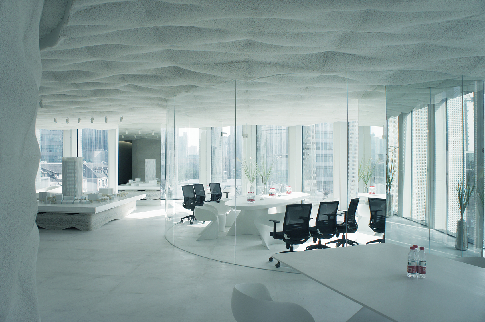 《上海虹口SOHO》,2015年12月建成,主要功能为办公楼,其楼下拥有一个共享空间供办公用。建筑一侧面开放并与城市连接。建筑师温和的处理了建筑与城市的关系,具体表现在了对立面和公共空间的处理上。建筑底楼共享空间供办公用,在立面上,建筑师用18mm宽的铝条设计了褶皱型的分隔,在形状上类似女人裙子上的编织花边。褶皱在一天不同角度,强度,色彩的阳光照耀下,立面会渐变出不同的效果。建筑公共空间的内部装饰像是生物的皮肤,室内石头材质和铝条的穿拆搭配使用创造出了一种与传统“硬”建筑完全不同的氛围。