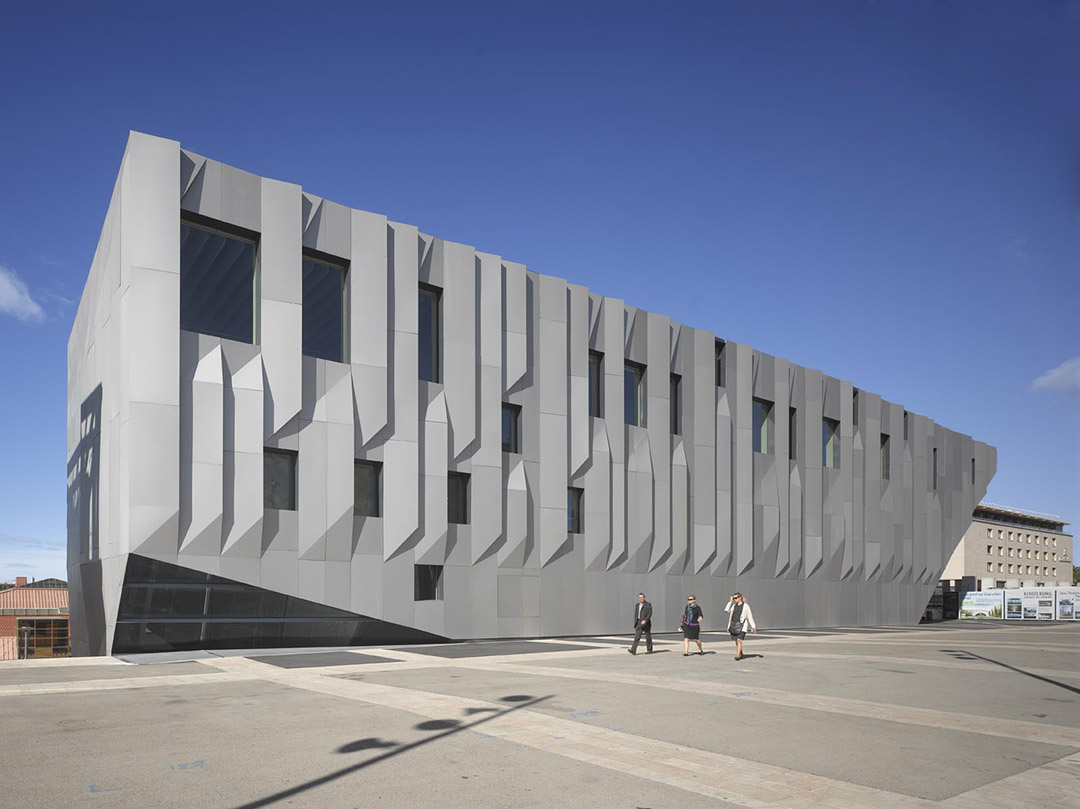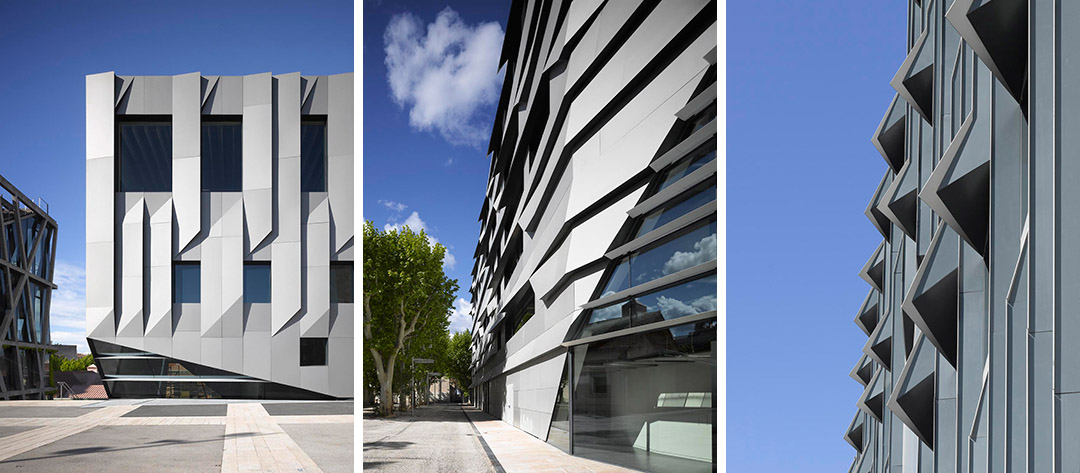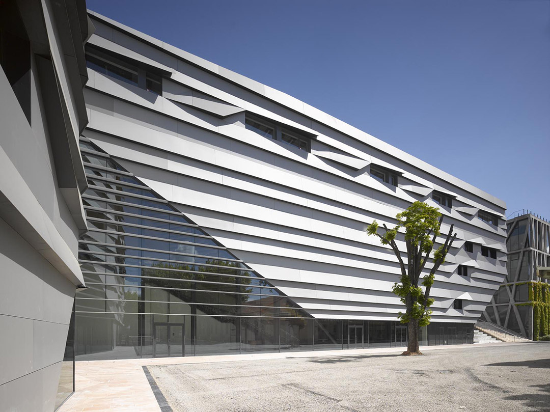《普罗旺斯地区艾克斯音乐学院》该项目是音乐学校、音乐厅和各类其他设施的综合建筑。本区域内的地势存在很大差异,其相邻地区的地势也颇不平坦。为了解决这个问题,整个建筑选择铝材作为构成立面的单一材料,并对其进行了局部折叠。折叠之后的薄铝板为立面带来了微妙的阴影,由此产生的光影代替铝材成为了立面的主要元素。这个设计灵感来自该区域的伟大艺术家Paul Cézanne和折纸艺术。