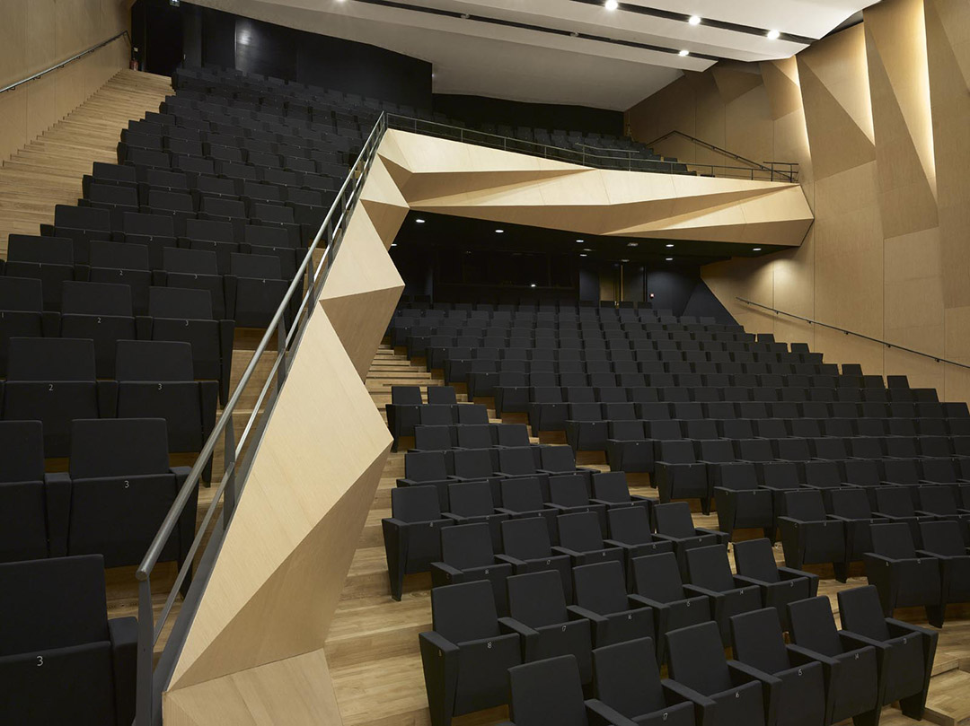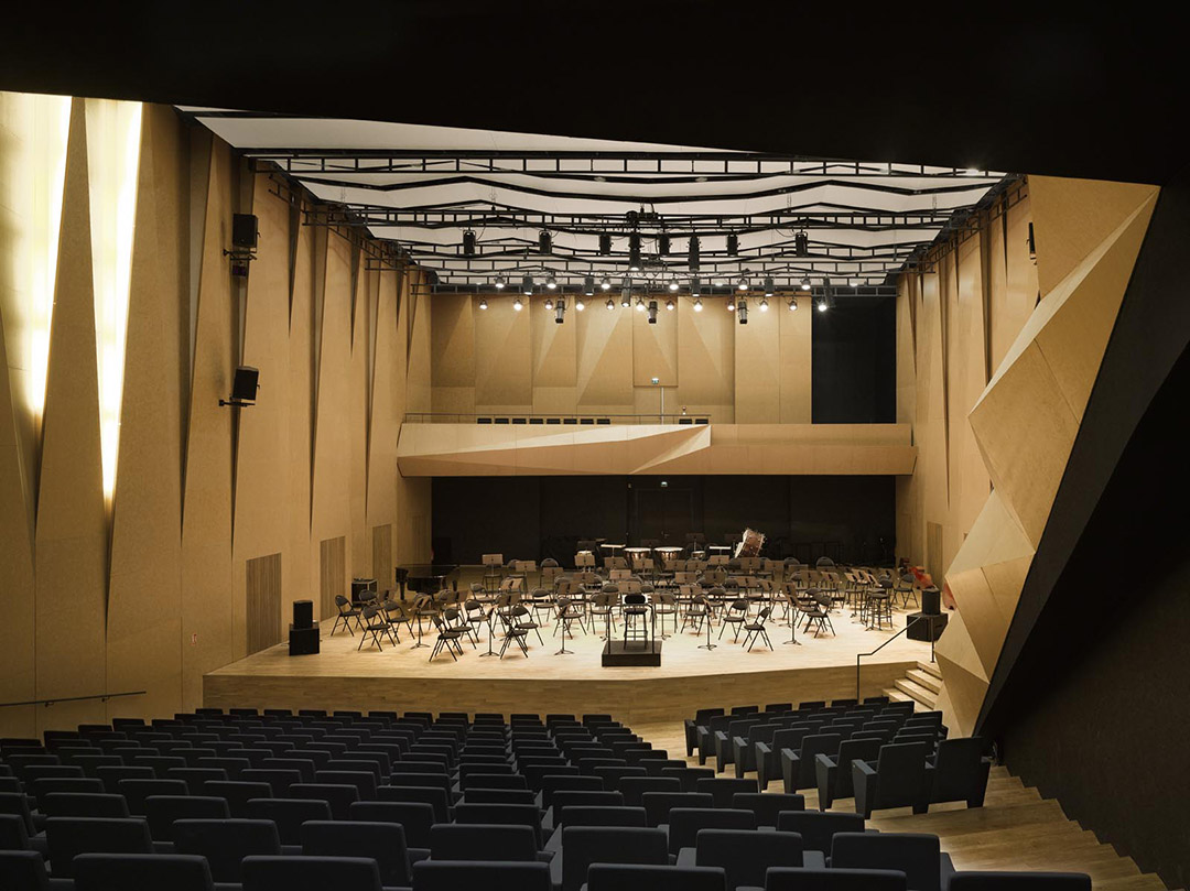 其中,音乐厅也同样运用折叠元素形成了非对称的内部构造,与Darius Milhaud多彩而自由的音乐产生共鸣。