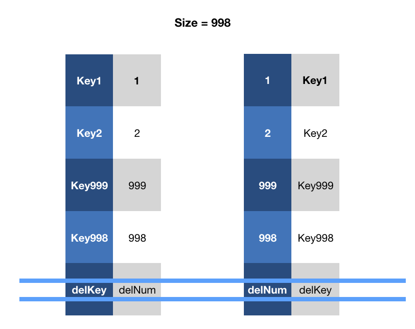删除key时,将末尾元素与删除元素的index互换,删除该元素。并将size-1。