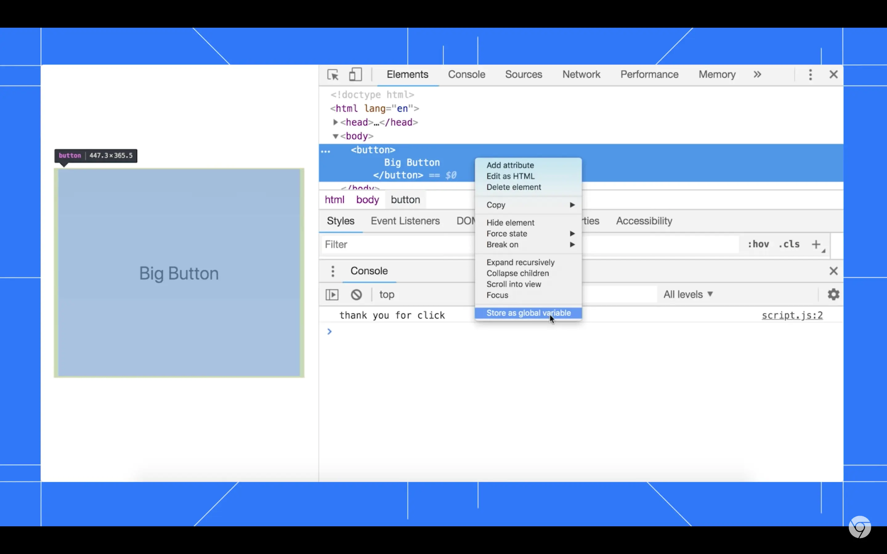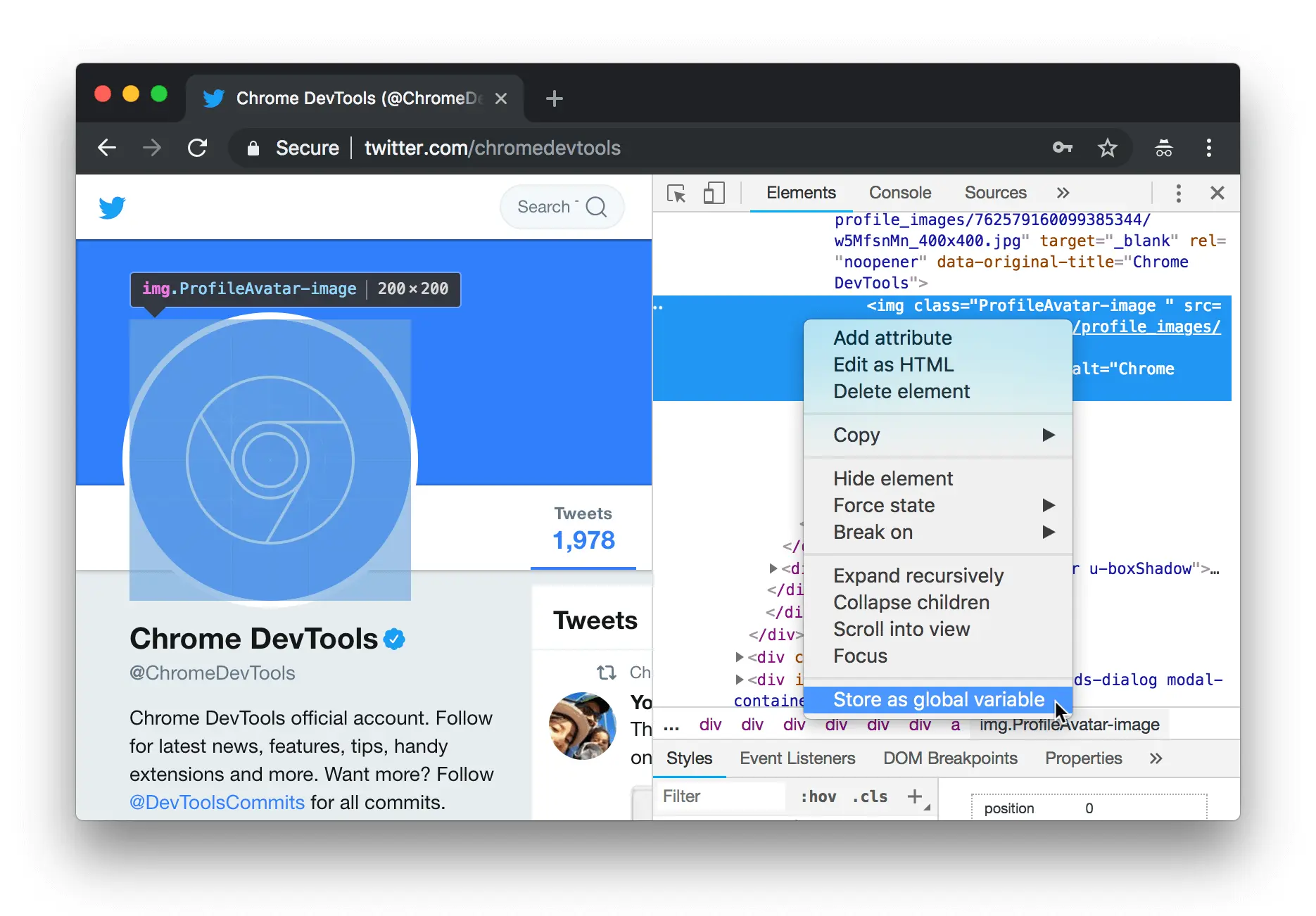 或者, 在 DOM 树中右击该节点, 然后选择 Store as global variable.