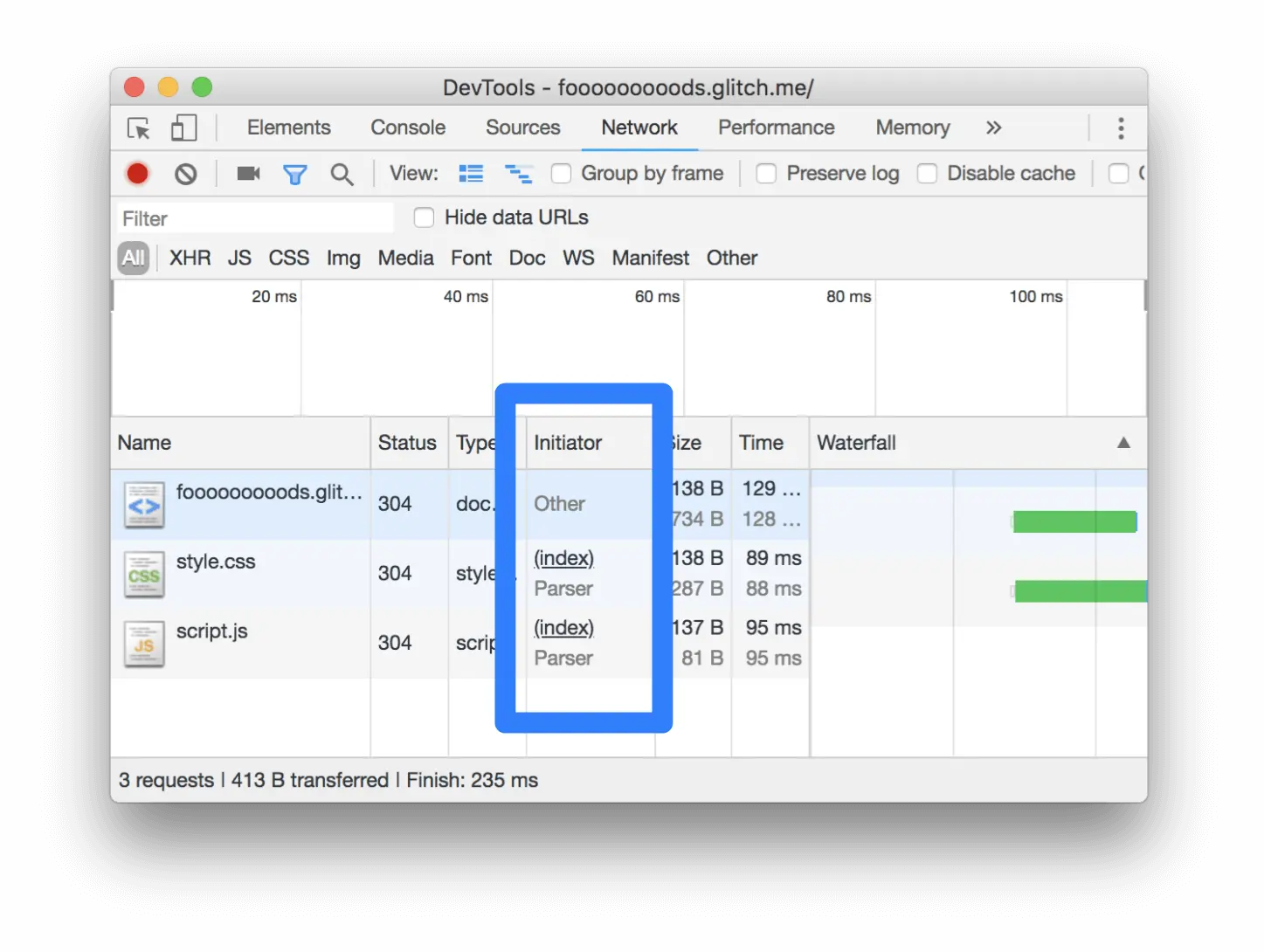 _initiator 字段提供了有关导致该资源被请求的更多上下文. 其和 Requests 表格中的 Initiator 列相对应.