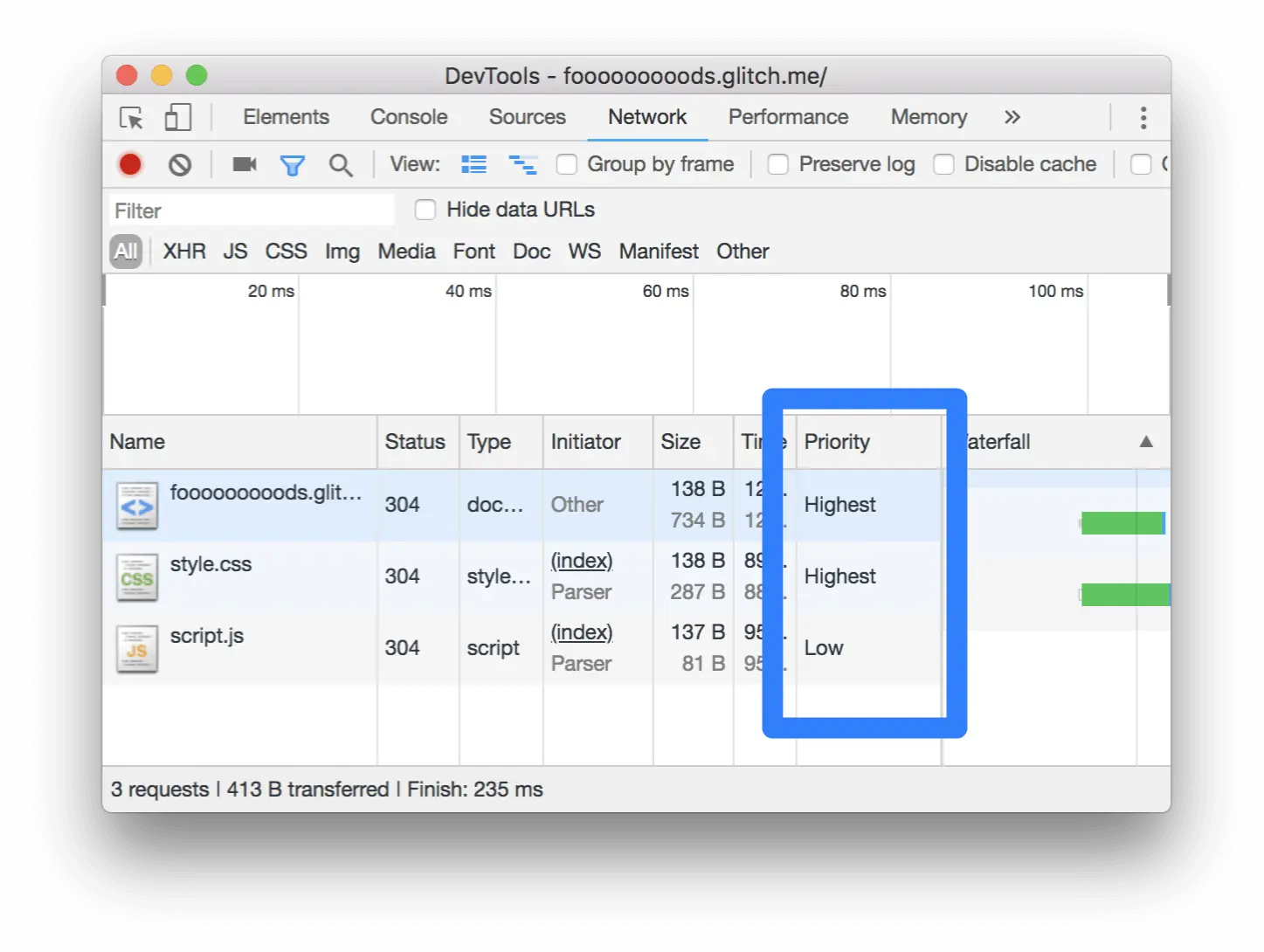 右击 Requests 表格的头部, 然后选择 Priority 来显示 Priority 列.