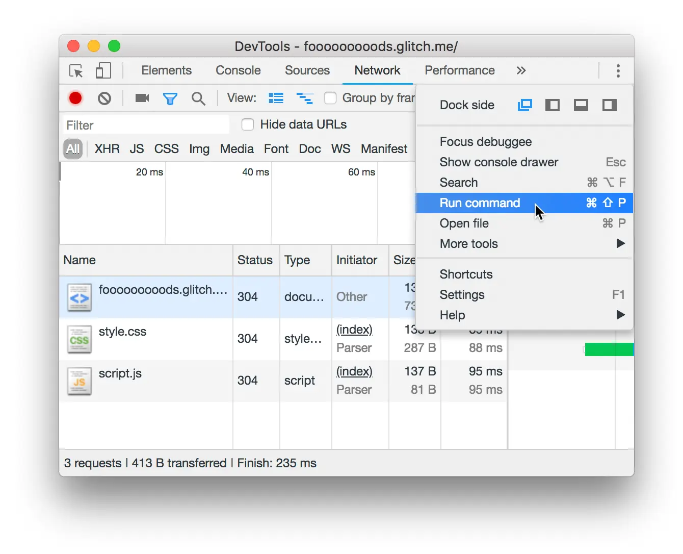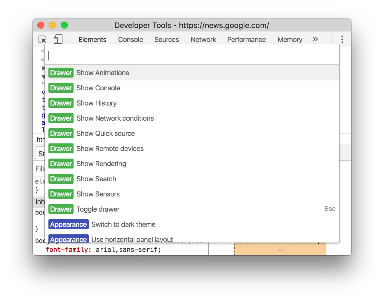 使用命令菜单来快速进入 DevTools 面板, 标签, 和特性.