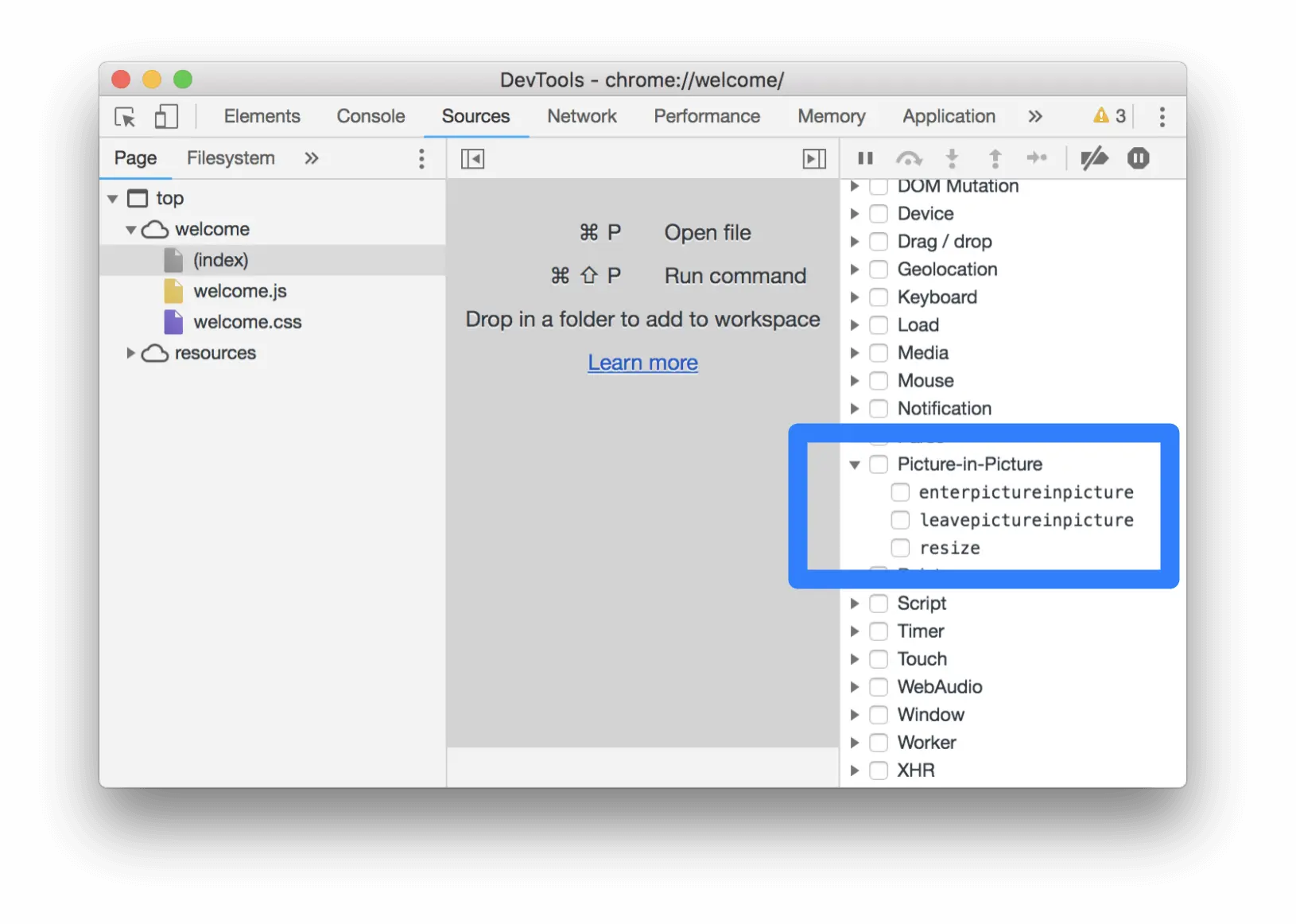 在 Event Listener Breakpoints 面板 选中 enterpictureinpicture, leavepictureinpicture, resize 复选框, 来在任意一个 picture-in-picture 事件触发的时候停止执行. DevTools 停止在 处理函数 的第一行.