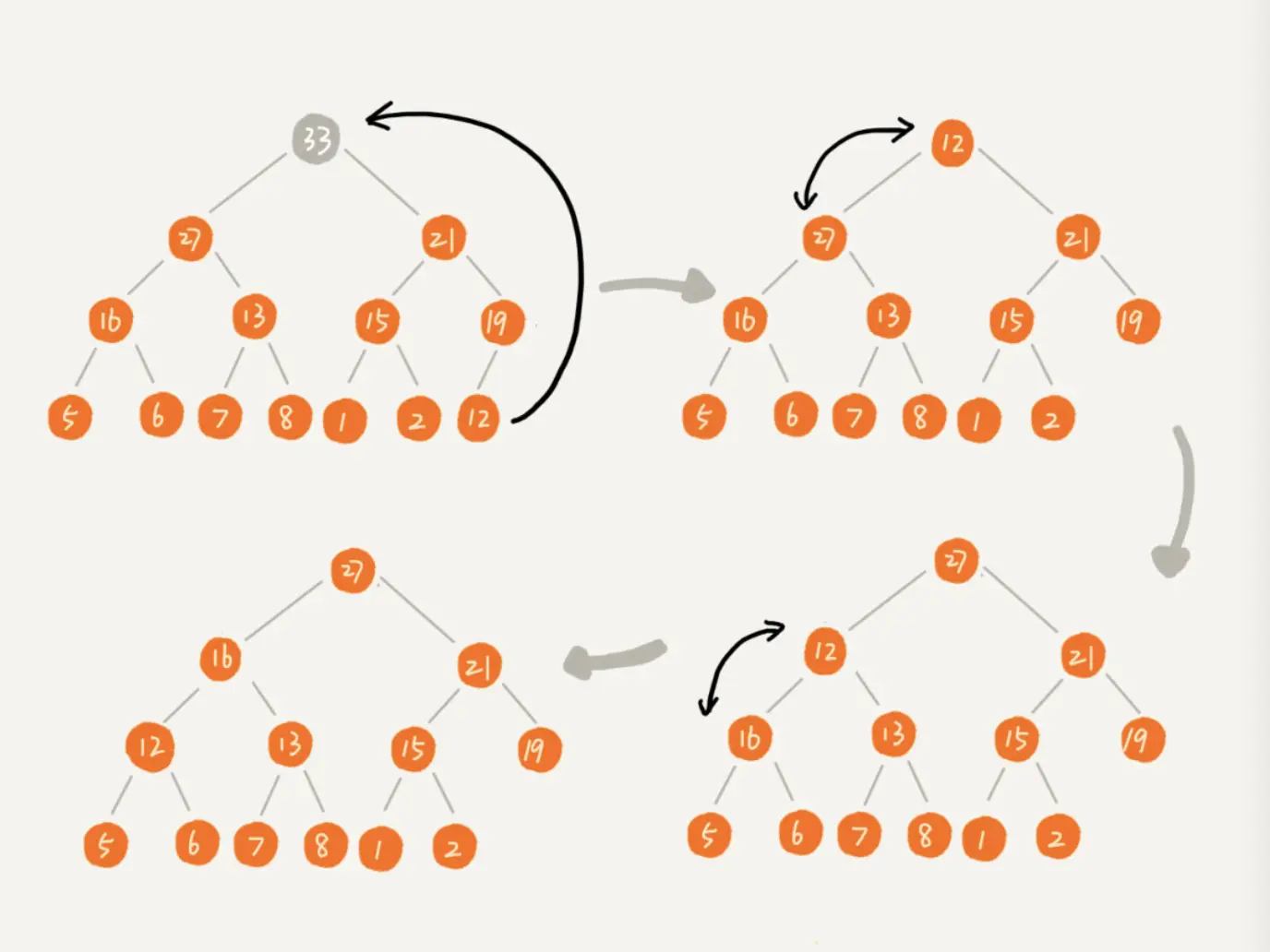 - 排序 大顶堆已经排序好了,现在堆顶的元素肯定是数组中最大值,因为要原地排序且不能破坏堆的结构因此将堆顶元素与尾节点交换(类似删除操作),之后对新顶节点进行自上向下堆化(堆的范围1~n-1),完成后,堆顶又是最大元素。以此类推,每次将堆顶拿出,也就是每次找到剩余元素的最大值。重复n次所有元素就都排好了。