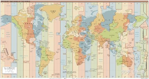 关于任何物理量,首要的事情就是确定如何度量。我们知道,时间的标准度量单位是秒。最初秒是由天(地球自转一圈的时间)来定义的,这样就产生了Universal Time(UT1),也称为民用时(civil time)。世界时是以格林尼治所在地的本初子午线的平子夜时起算的平太阳时(具体意义可以百度百科),即世界时的中午12点就是太阳正好经过格林尼治所在经线的时间(此时对格林尼治当地来说,太阳高度最高)。由于各地的人们都希望把正午(即太阳高度最高的时候)定义为中午12时,这样就产生了wall-clock time,即本地时间。下图显示了时区的划分。
