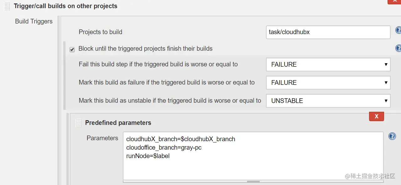 发展到这,项目都可以复用一个构建任务,如下图,由上游项目传不同的参数触发