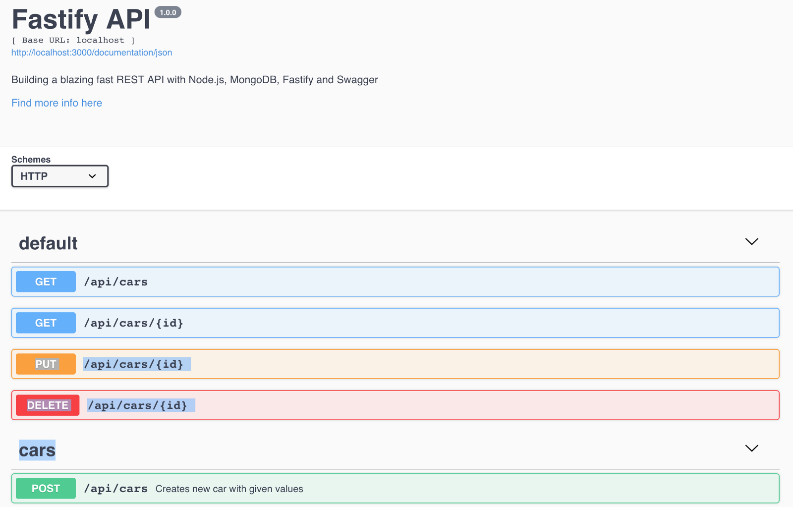 ...await fastify.listen(3000)fastify.swagger()fastify.log.info(`listening on ${fastify.server.address().port}`)...And that is it! If you now navigate to http://localhost:3000/documentation, you should see the following: