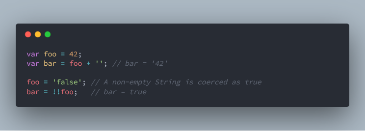 Implicit coercion is the harder type of conversion to see, so developers often avoid using them. Yet, it’s good to know some common implicit coercions. Here are examples for String and Boolean.
