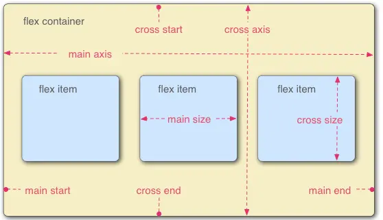 - 容器默认存在两根轴: 主轴(项目沿主轴进行一一排列)、交叉轴(垂直于主轴)