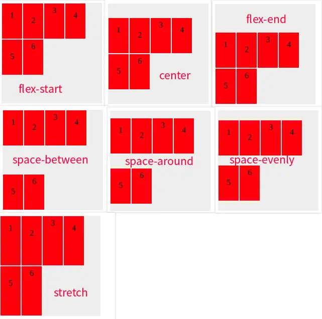 justify-content: flex-start | flex-end | center | space-between | space-around | space-evenly