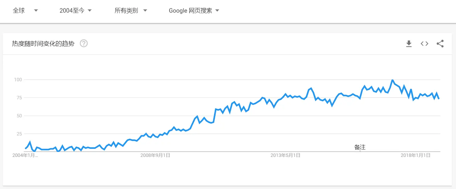 小j开始彰显出了话痨的本质:“我和你说哦,虽然我也才来这三秒钟,但是对这里的情况已经了解了个大概了呢。我们的大家庭HBase,近年来不断发展壮大,已经名声远扬了,我真感到自豪,这是关键词搜索在全球的趋势,怎么样厉害吧。”说着他掏出了下面这张图。