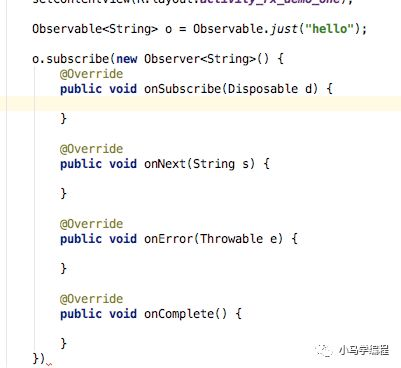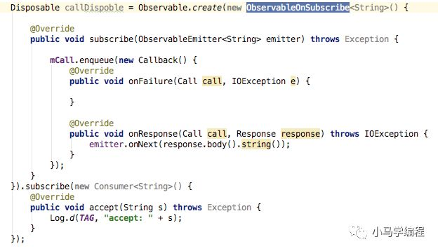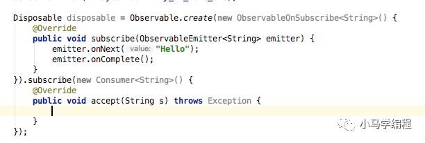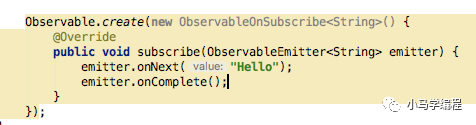 这里调用 create 方法发布一定可观察到事件源,这方法接受一个 ObservableOnSubscribe 对象作为参数。在java 中通常都用匿名类来实现函数式编程。这里我们分析一下语法吧,使用英文的语法,而非 code 。在这里 subscribe 是订阅意思,大家都清楚吧,OnSubscribe 表示订阅的可观察对象。我们需要来实现他的订阅方法,方法提供以参数供我们使用,就是可以发射发射器的对象,