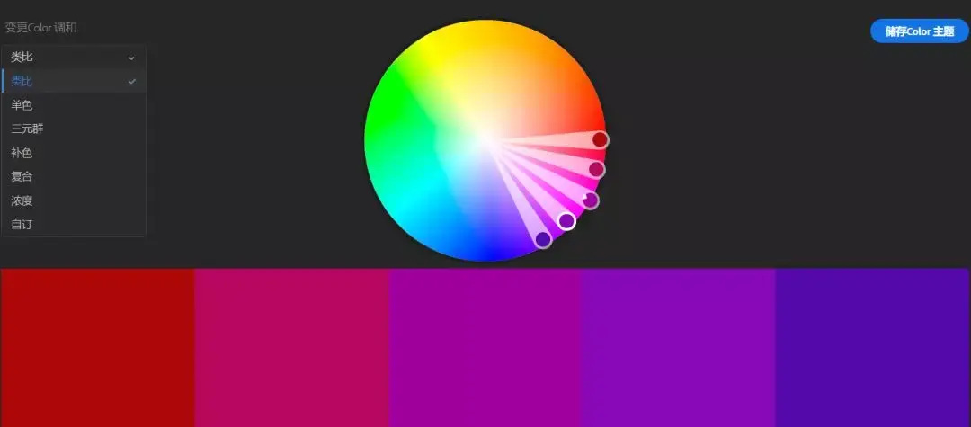 Adobe官方的配色网站,可以根据互补色,对比,单色等等方案去配色,网站打开速度可能会比较慢...