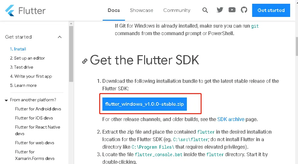 1.1 点击这里,下载flutter sdk压缩包 flutter.io/docs/get-st…