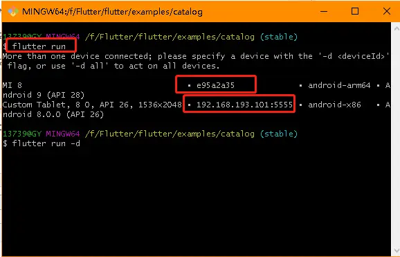 2.3 这里再补充一点,如果你的机器上连接了不止一个设备,比如说有真机,还有模拟器,那么你允许flutter run 他会提示你选择在