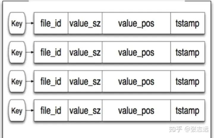 Bitcask在内存中保存了key,value的位置关系,索引关系,key对应数据key, value保存不是实际的数据值,而是保存对应文件的相关信息,从图中可以看到是 file_id, value_sz, value_ops, tstamp,由于内存实际不保存真实数据,所有存储容量就会大大提升。