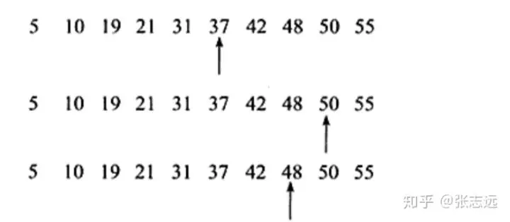相信大家都了解过一种基础的算法,二分查找法,以有序中点为间隔,使用跳跃式的方式,能快速将一组有序的数据结构中找到需要查找的值。如在下列数组中查找到48,使用3次就可以了。