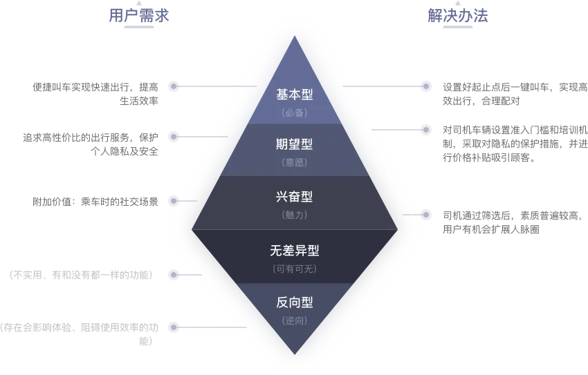 用户需求&解决办法:需求可以从实际数据和用户反馈中提炼出来,有些运营团队会通过组建铁粉群、论坛、问卷调查等方式集中活跃的目标用户,在这里可以得到他们的诉求,当然最好的方法还是面对面做访谈。解决办法对应到需求,可以利用“KANO模型”归类,举例: