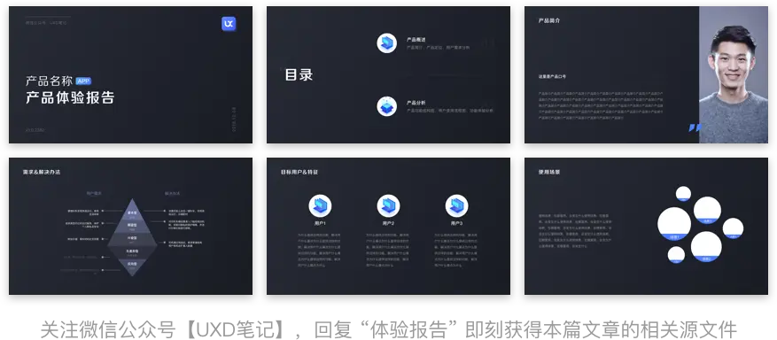 注意:制作一份产品体验报告,你要面向的是企业高层、上级领导、面试官、产品团队的同事、客户等,所以需要结构清晰,排版精美、简洁,这样才会让人很有读下去的欲望,正如文章开头所说:可呈现、可阅读、可传承。特别是自己以设计师的身份拿出报告的时候,排版是否精美、信息主次区分是否明显,也是对自身专业性的一种考量(文章最后我会分享一些简单的模板供大家参考)