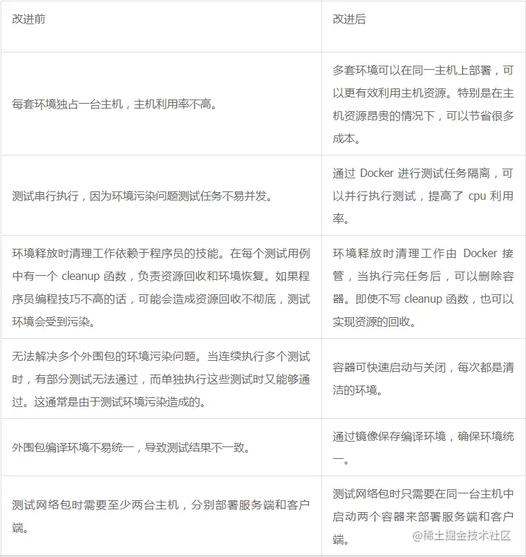 由于容器与主机共享内核使用,凡是和内核无强相关的测试任务是适合引入 Docker 进行改造的,例如源码编译测试、软件安装测试、互联网应用测试、数据库测试等。而与内核强相关的测试任务是不适合使用 Docker 进行改造的,如内核网络模块测试、内核 namespace 特性测试等。