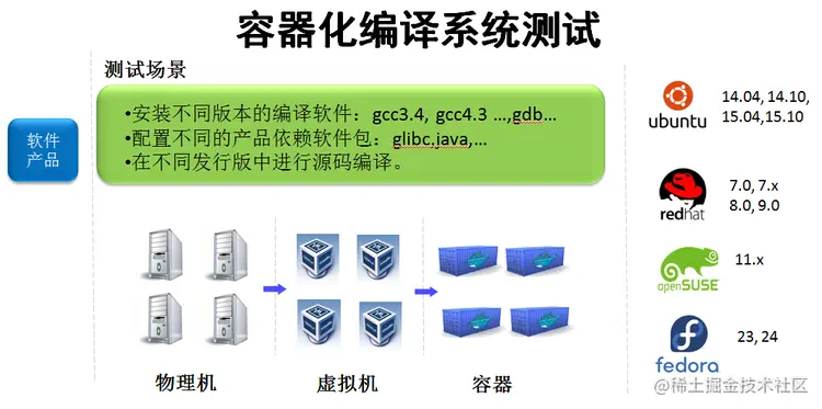编译系统测试是用户态的测试,非常适合使用 Docker 进行加速。如果需要针对某一个 linux 发行版进行测试,可以通过 Docker 快速部署的特点,将所有的资源快速利用起来,从而达到加速测试执行的目的。