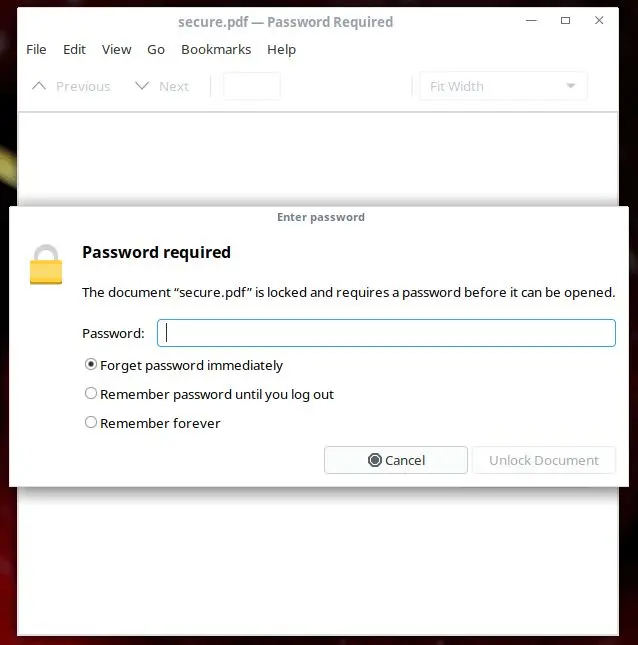 我有一个受密码保护的 PDF 文件,名为 secure.pdf。每当我打开这个文件时,它提示我输入密码来显示它的内容。