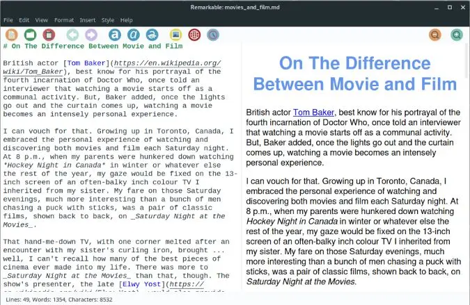 Remarkable 复杂性介乎于 Ghostwriter 和 Abricotine 或 Mark Text 之间。它有一个带点现代风格的双栏界面。它有一些有用的特点。