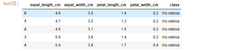 5.1,3.5,1.4,0.2,Iris-setosa 4.9,3.0,1.4,0.2,Iris-setosa 4.7,3.2,1.3,0.2,Iris-setosa 4.6,3.1,1.5,0.2,Iris-setosa 5.0,3.6,1.4,0.2,Iris-setosa 5.4,3.9,1.7,0.4,Iris-setosa 4.6,3.4,1.4,0.3,Iris-setosa import pandas as pd import matplotlib.pyplot as plt import numpy as np iris_data = pd.read_csv('C:\\ML\\MLData\\iris.data') iris_data.columns = ['sepal_length_cm', 'sepal_width_cm', 'petal_length_cm', 'petal_width_cm', 'class'] iris_data.head()