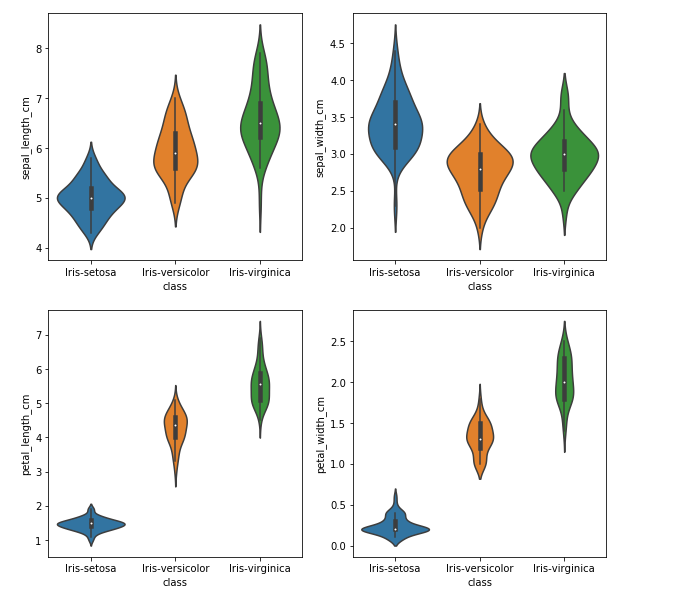 plt.figure(figsize=(10, 10)) for column_index, column in enumerate(iris_data.columns): if column == 'class': continue plt.subplot(2, 2, column_index + 1) sb.violinplot(x='class', y=column, data=iris_data)