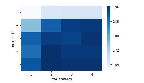 grid_visualization = [] for grid_pair in grid_search.cv_results_['mean_test_score']: grid_visualization.append(grid_pair) grid_visualization = np.array(grid_visualization) grid_visualization.shape = (5, 4) sb.heatmap(grid_visualization, cmap='Blues') plt.xticks(np.arange(4) + 0.5, grid_search.param_grid['max_features']) plt.yticks(np.arange(5) + 0.5, grid_search.param_grid['max_depth'][::-1]) plt.xlabel('max_features') plt.ylabel('max_depth')