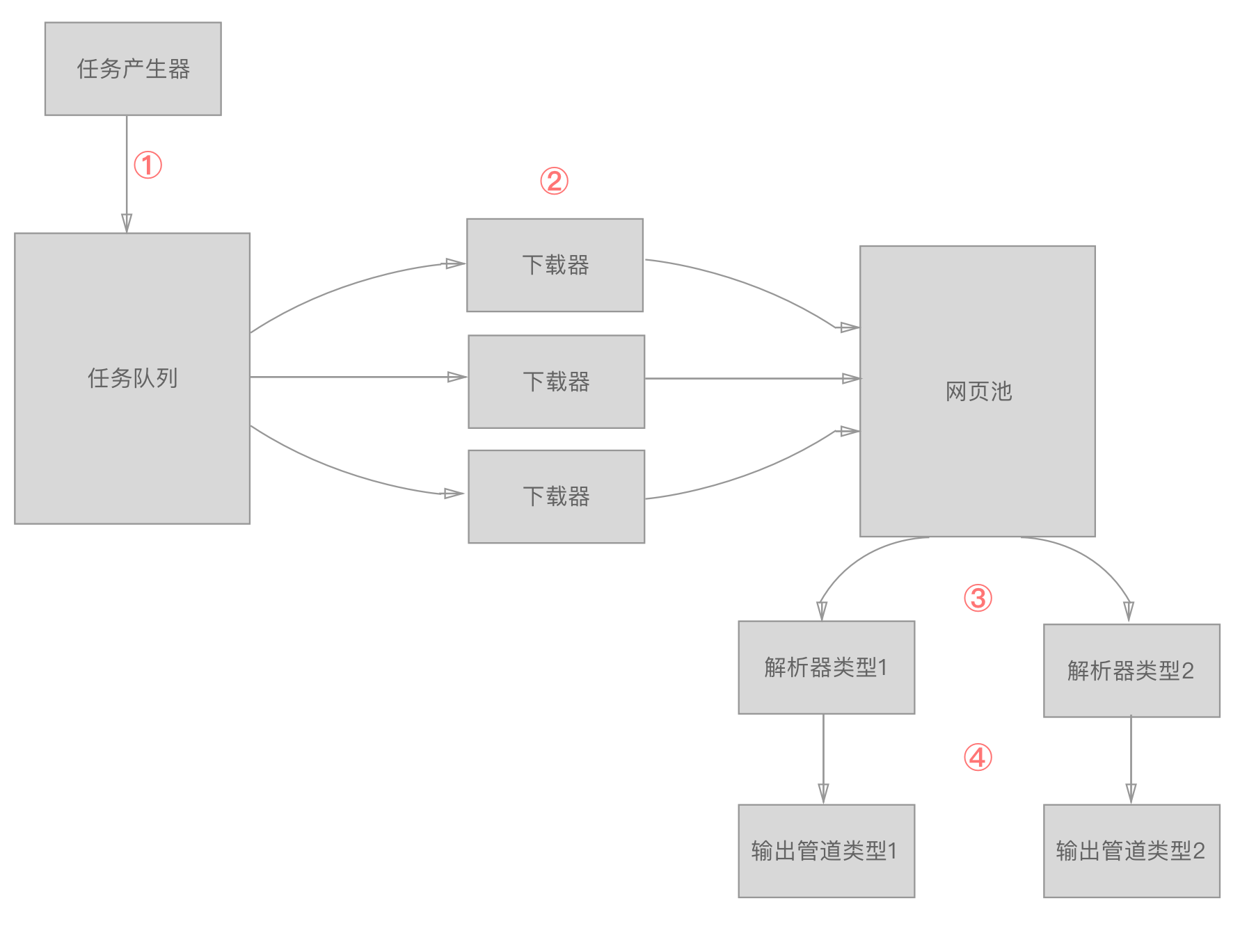 - 3 . 不同的解析器取出网页进行解析,传给对应的输出管道。期间,解析器也会产生新的下载任务,放入到任务队列中。