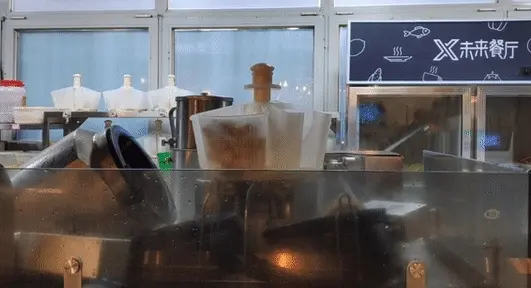 “炒锅”通过旋转来实现不断翻炒,经过设定的时间后,“炒锅”倾斜,将炒好的菜品装盘,这道菜就算完工了,可以由传菜机器人送到食客的桌子上了。
