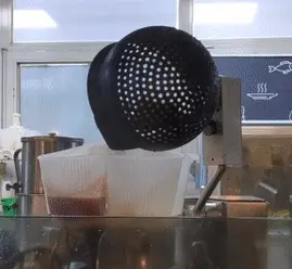 锅下面还藏着一个跟锅本身差不多大的“漏勺”,设定的焯水或过油时间到了之后,漏勺就会把食材从锅里捞出来,焯水的食材放回盒子,过油的食材则直接倒进另一侧的“炒锅”。