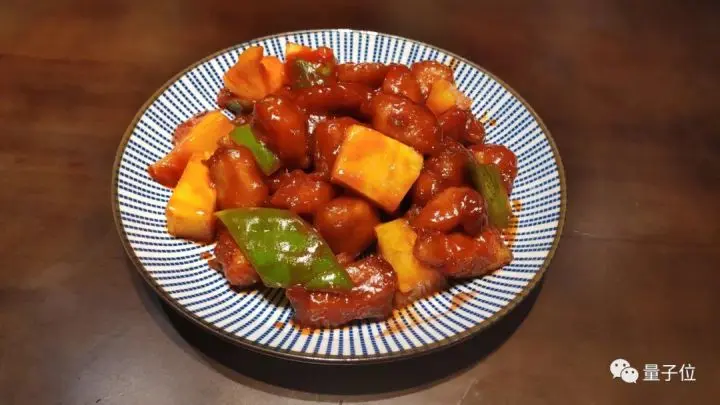 终于有肉菜了!一道散发着香味的菠萝咕噜肉被机器人送上来,看起来食欲大开。