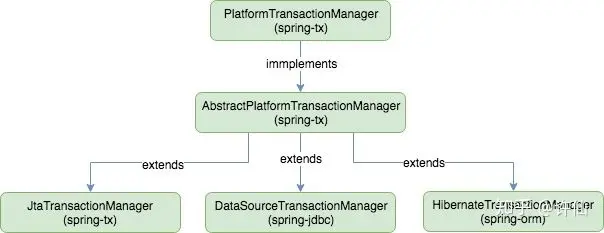 }Spring文档称PlatformTransactionManager是一个SPI(Service Provider Interface)。spring-tx模块提供这个最简单的事务管理器接口,并提供一个抽象类AbstractPlatformTransactionManager实现了这个接口。抽象类主要包含一些处理事务的公共逻辑,如处理事务传播等。具体的实现类,如spring-jdbc的DataSourceTransactionMananger则负责与数据库API的具体交互(例如开启事务的方法封装了getConnection、setAutoCommit(fasle)、setTransactionIsolation)。