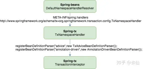 </aop:config>spring-tx包的META-INF里的配置文件spring.handlers配置了Spring-tx的NameSpaceHandler,以支持tx的自定义标签(tx:annotation-driven、tx:advice等)的解析。TxNamespaceHandler的关键步骤是注册了两个BeanDefinitionParser。