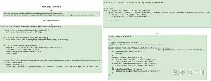 具体原理是,spring-tx开启事务时,将timeout设置到ThreadLocal中,txObject.getConnectionHolder().setTimeoutInSeconds(timeout); TransactionSynchronizationManager.bindResource(getDataSource(), txObject.getConnectionHolder())。而mybatis从Connection获取PreparedStatement,并将timeout应用到PrepareStatement上。