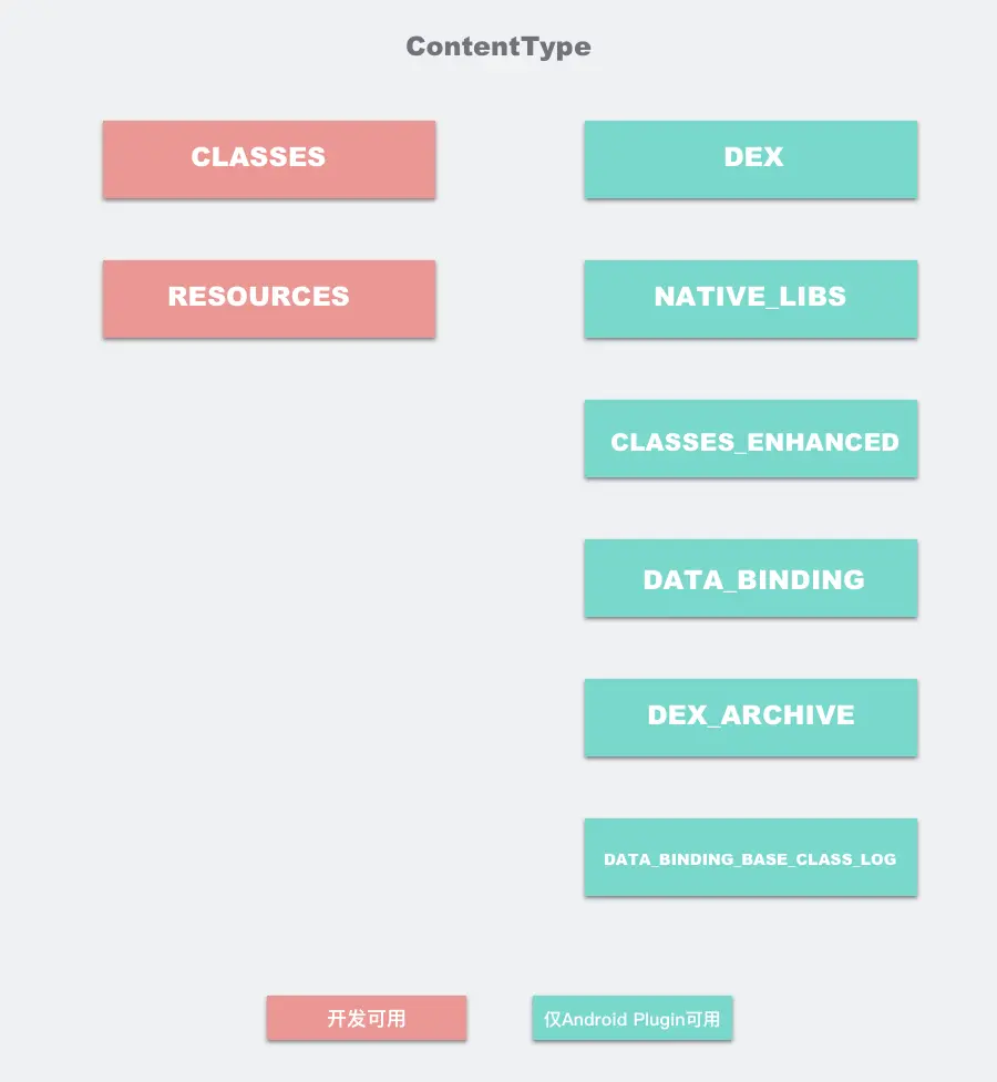 从图中可以看到,除了CLASSES和RESOURCES,还有一些我们开发过程无法使用的类型,比如DEX文件,这些隐藏类型在一个独立的枚举类ExtendedContentType中,这些类型只能给Android编译器使用。另外,我们一般使用