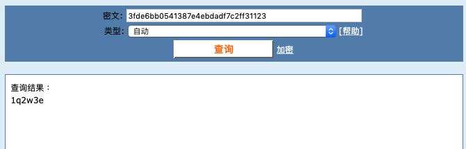 比如在 Terminal 中加密密码:1q2w3e --> 对应的 MD5 是 3fde6bb0541387e4ebdadf7c2ff31123 一下就是在网站去查询的结果,所以MD5相对不再安全了。