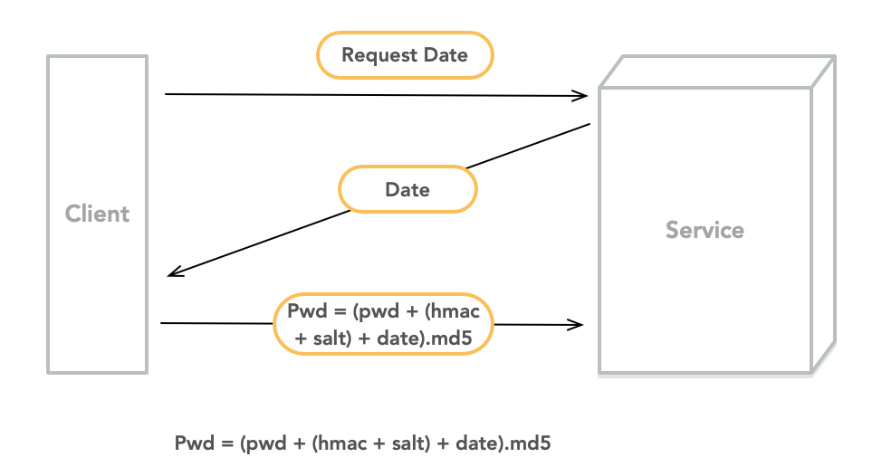 C --> 发送数据: pwd = (pwd + (hmac + salt) + date).md5