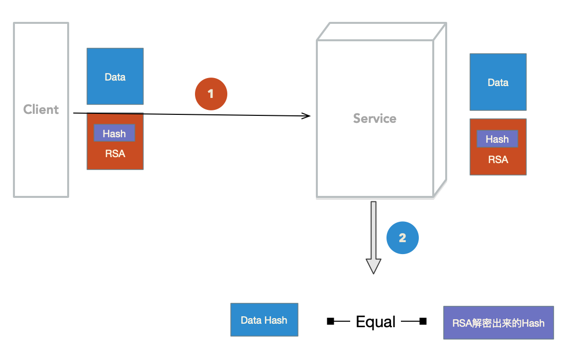 - 处理过程:客户端发送包(原始数据 + (原始数据的Hash + RSA)),服务器接收到后,先通过RSA解密,解出RSA加密的数据(原始数据的Hash),在求原始数据的Hash值,如果两个hash相等,那么就证明数据没有被篡改。