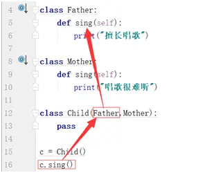 多继承关系中,当多个父类具有同名的成员,子类调时该成员时先调用继承关系中的第一个声明的类成员。